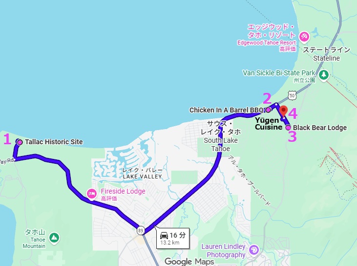 今日の記事は旅3日目、ピンクで示した箇所の旅行記、カリフォルニア州・サウスレイクタホ(タホ湖)周辺のランチとディナーなどについて