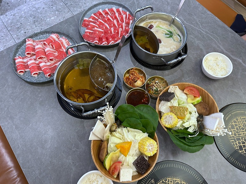 オーダーした火鍋のお肉と具材以外は、ビュッフェコーナーで各自自由に調達できて、火鍋のタレ、麵、キムチ、スイーツ、かき氷などがありました。