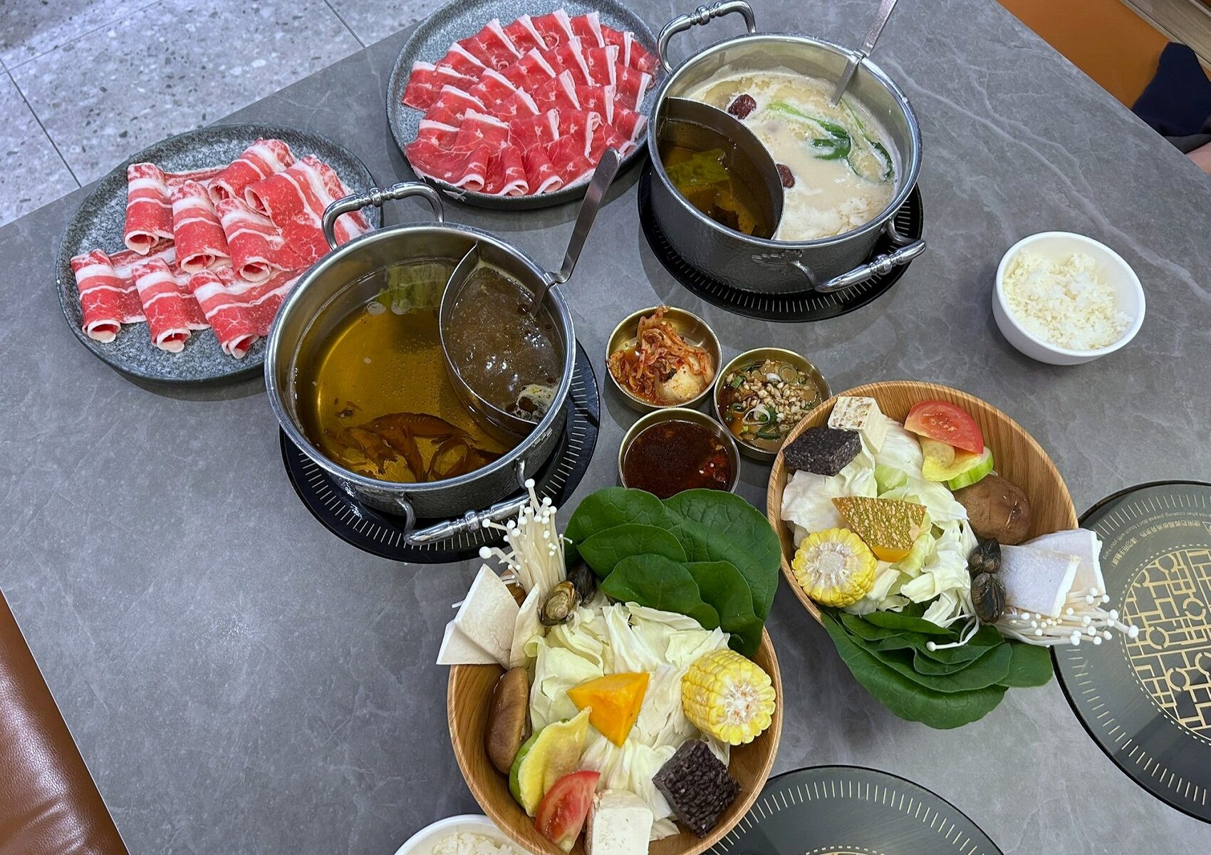 オーダーした火鍋のお肉と具材以外は、ビュッフェコーナーで各自自由に調達できて、火鍋のタレ、麵、キムチ、スイーツ、かき氷などがありました。